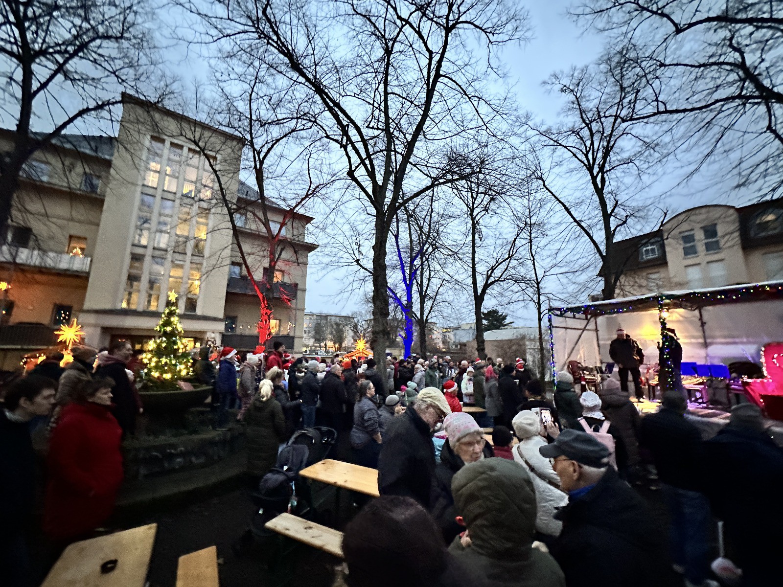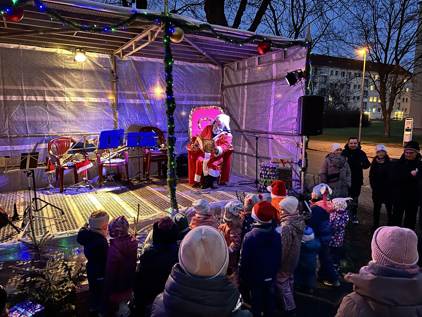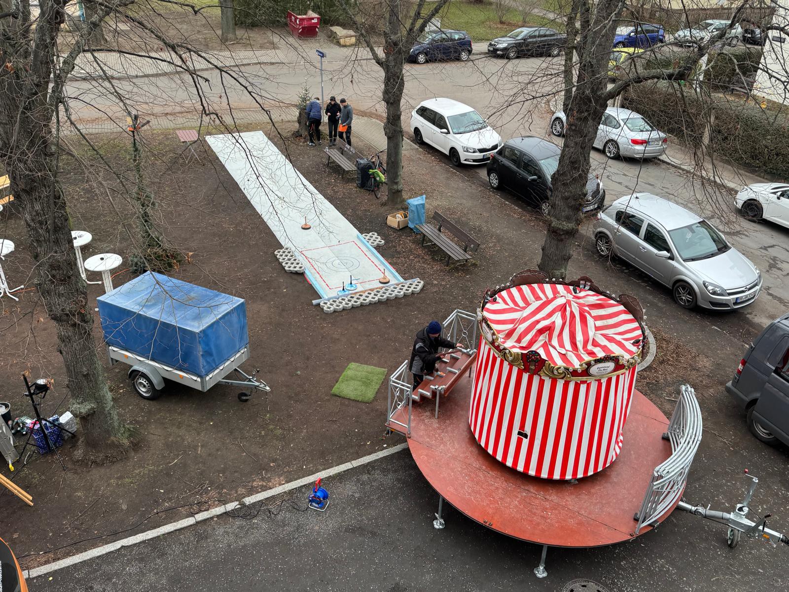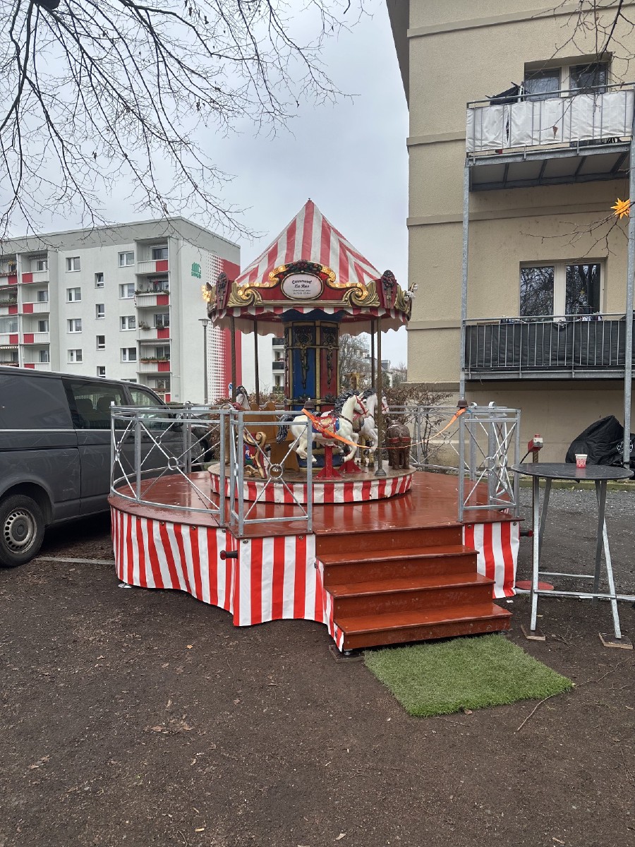 Am 14. Dezember waren ab 15 Uhr die Anwohner im Stadtteil Übigau eingeladen, es sich auf unserem Weihnachtsmarkt gemütlich zu machen. Das Wetter war perfekt und der Glühweinstand war dabei der absolute Renner. Neben diesem konnte man noch Bratwürste und süße vorweihnachtliche Leckereien essen. Ein Karussell für die Kinder und eine Eisstockbahn luden zur Bewegung ein. Hier konnten auch für die ersten 3 Plätze jeweils ein Übigauer-Eisstock-Pokal überreicht werden. Die Hütten waren weihnachtlich geschmückt, auch der Brunnen war schön dekoriert und in Lichterglanz gehüllt so dass auf dem sonst etwas trostlos wirkendem Mengsplatz ein stilvolles gemütliches Ambiente herrschte. Die Begeisterung bei unseren Übigauer Kindern war groß, als auf dem Mengsplatz der Weihnachtsmann zu Besuch kam. Er hatte eine Weihnachtsgeschichte im Gepäck und nahm die Wunschzettel der vielen Kinder entgegen. Im Anschluss stimmten die Kinder spontan Weihnachtslieder an und die Besucher sangen mit, so ging es musikalisch durch den Abend. Zwischendurch unterhielten die “Rödertaler Musikanten” mit bekannten Weihnachtsliedern bei Glühwein und Bratwurst die Anwohner mit Blasmusik.