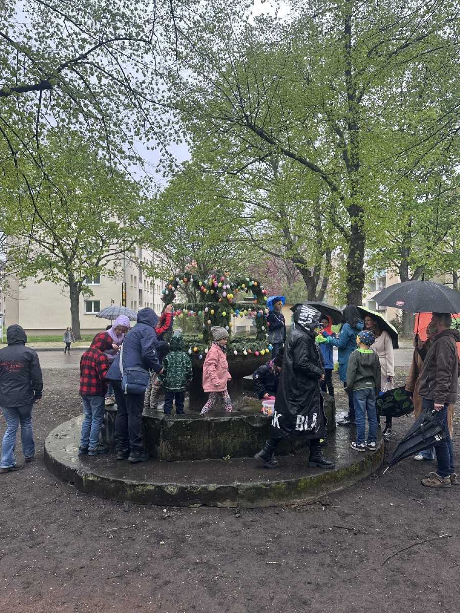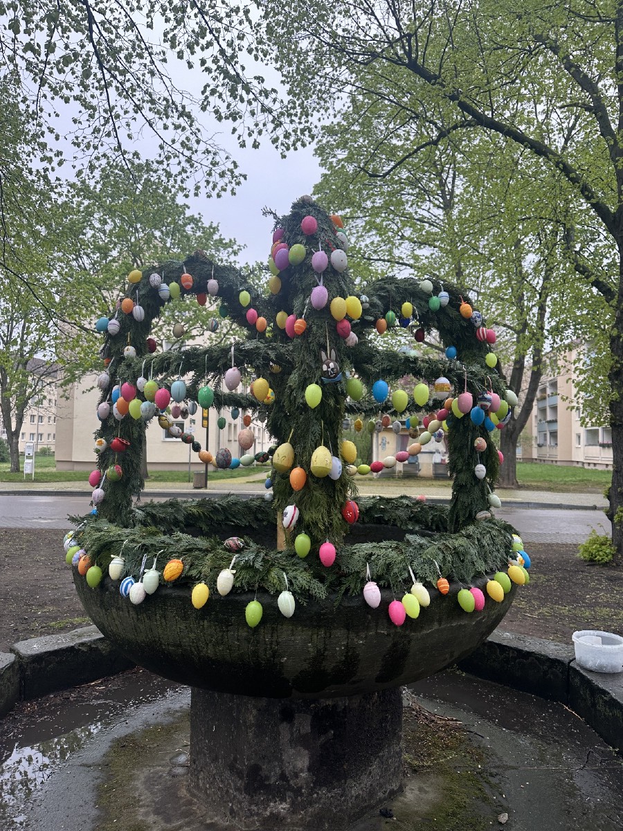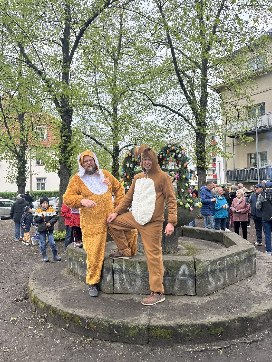 Kurze Sichtungen dieser Hasen-Vertreter gab es am Ostersonnabend bei der Feuerwehr, der Lindenschänke und schließlich auf dem Mengsplatz. Dieser war mit einer eigens hergestellten Osterkrone auf dem Brunnen und vielen bunt bemalten Ostereiern geschmückt.