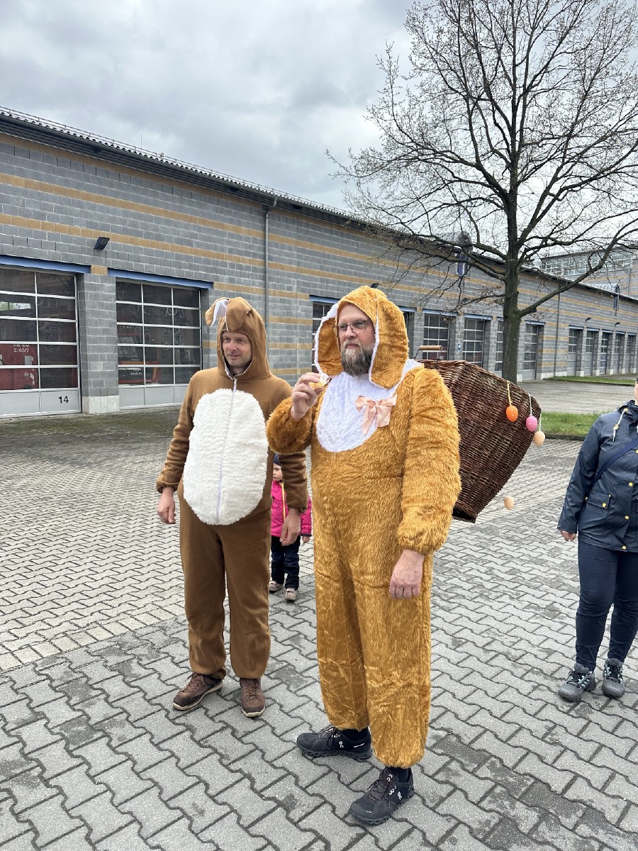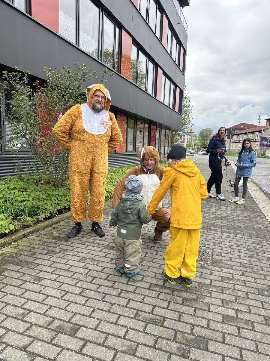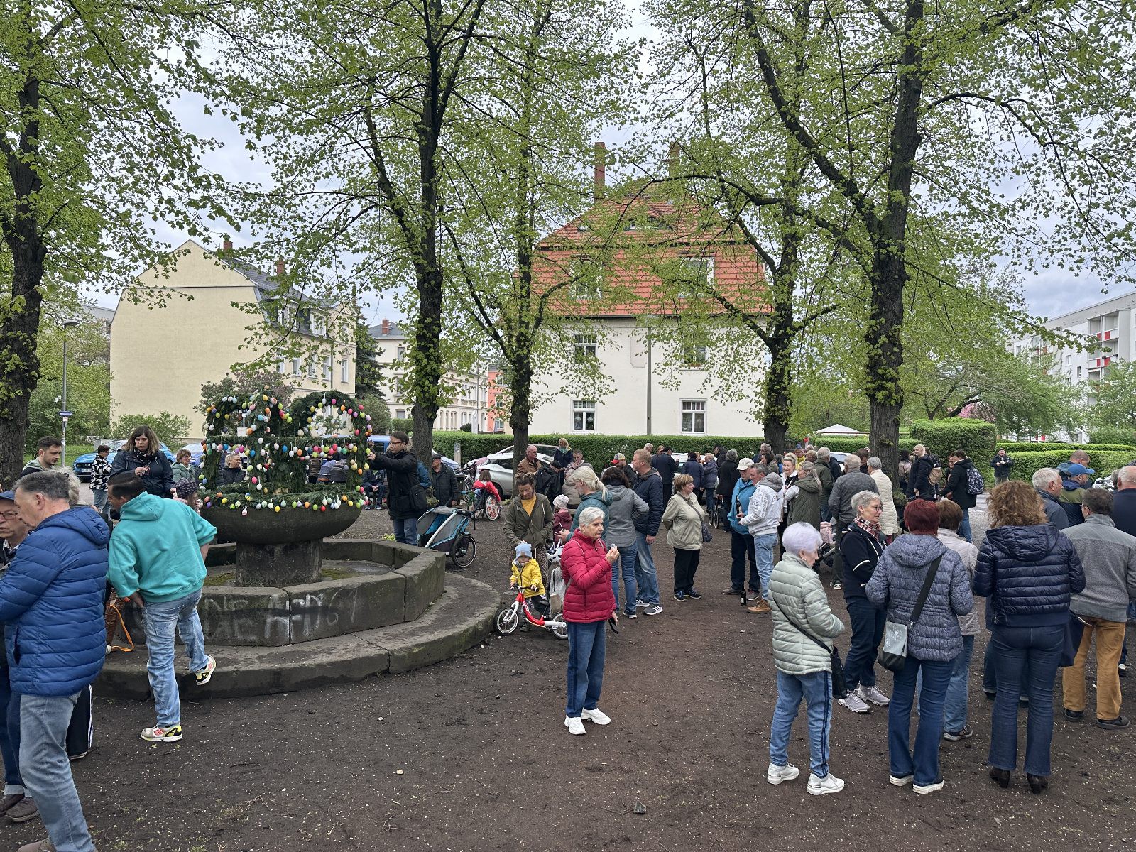 Kurze Sichtungen dieser Hasen-Vertreter gab es am Ostersonnabend bei der Feuerwehr, der Lindenschänke und schließlich auf dem Mengsplatz. Dieser war mit einer eigens hergestellten Osterkrone auf dem Brunnen und vielen bunt bemalten Ostereiern geschmückt.