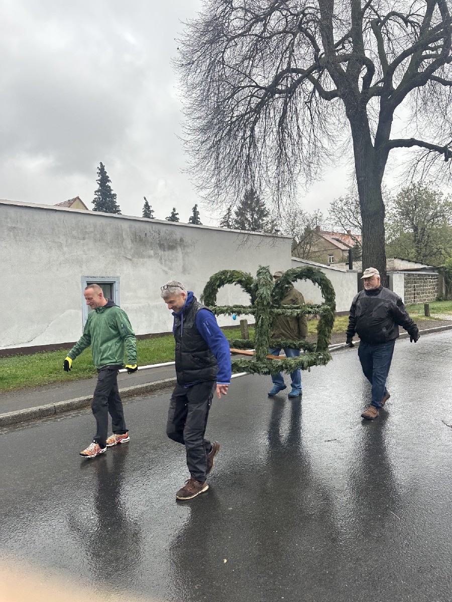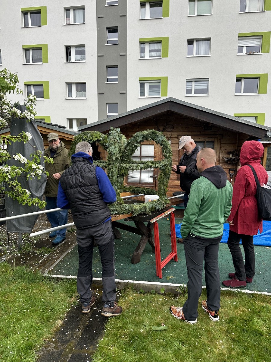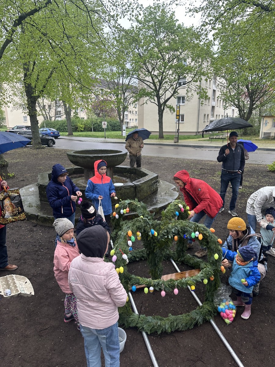 Das regnerische Wetter am Karfreitag 2025 lud eigentlich eher zum daheim bleiben ein, doch die Neugier, was sich wohl auf dem Menge Platz tut, war groß. Ein Osterkranz wurde von 100 Händen geschmückt.